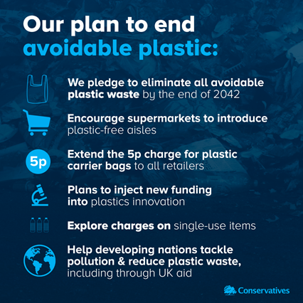 This includes a pledge to eliminate all avoidable plastic waste by the end of 2042, encouraging supermarkets to introduce plastic-free aisles, extending the 5p charge for plastic carrier bags to all retailers and issuing a consultation on taxing the most environmentally damaging plastics. All this builds on the Government’s work in recent months for environmentalism that is central to conservatism.